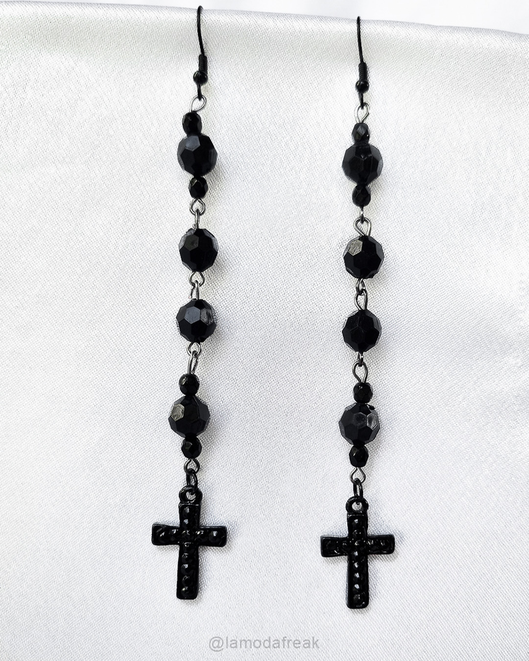 Descrição da peça: Brinco com anzol de metal preto, esferas sextavadas em ABS pretas e pingente de cruz de metal preta.