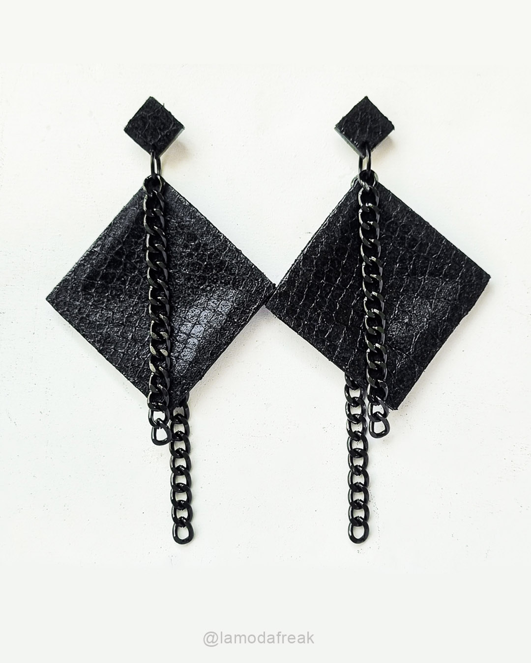 Descrição da peça: Brinco de pino feito com couro sintético preto e corrente preta de alumínio (não enferruja, não perde a cor, não pesa).