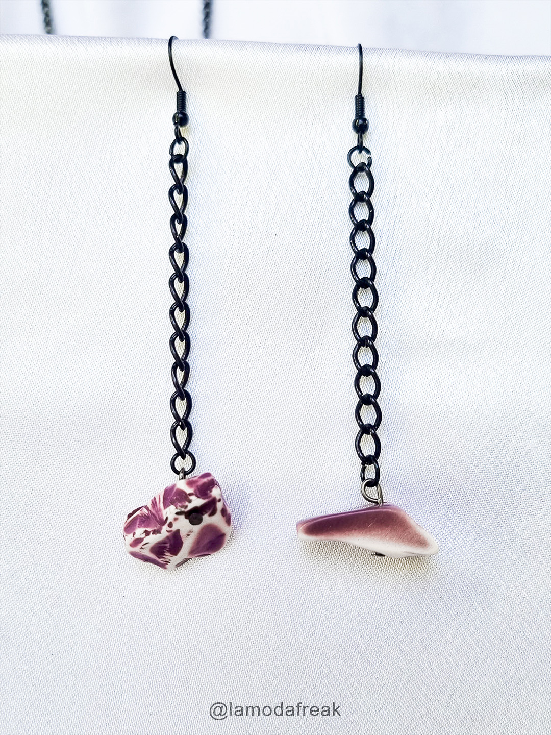Descrição da peça: Brinco tipo anzol na cor preta, correntinha de alumínio preta e pedras em ABS em tons de roxo. As pedras são de formatos diferentes, criando um estilo assimétrico ao brinco.