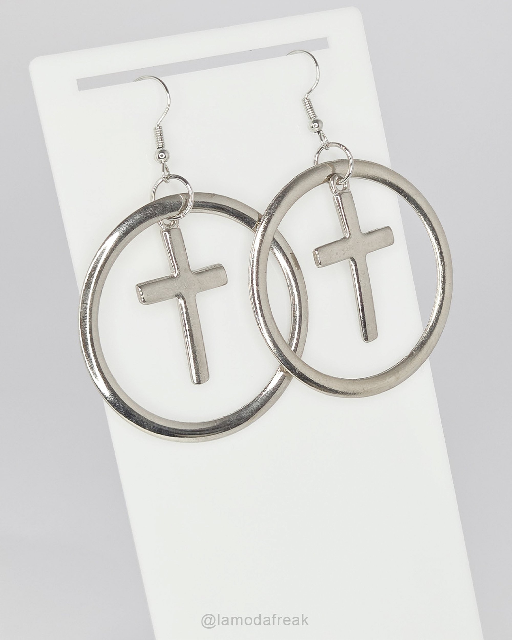 Descrição da peça: Brinco tipo anzol com argola e pingente de cruz em metal prateado. A argola não é roliça, é "achatada".