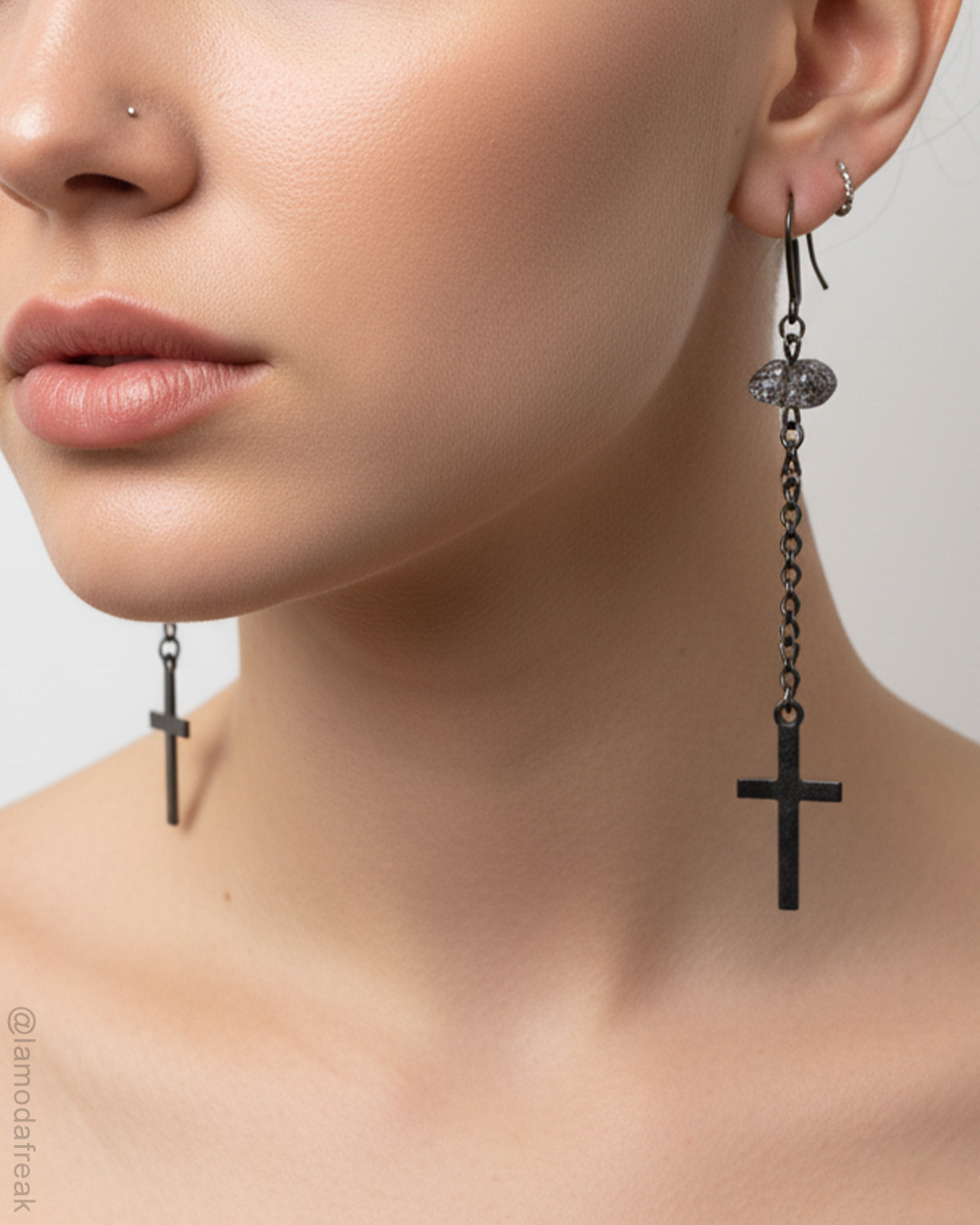 Descrição da peça: Brinco de anzol fechado na cor grafite, cascalho de cristal Cricket, correntinha de alumínio grafite e pingente de cruz em metal grafite.
