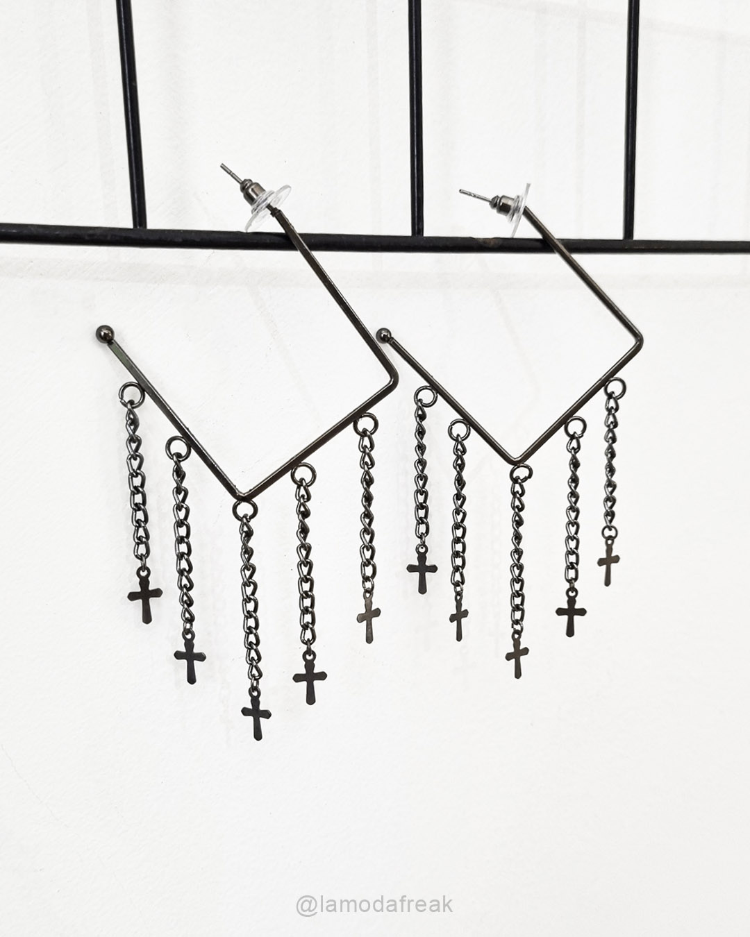 Descrição da peça: Brinco em formato quadrado com correntinhas e pingentes de cruz na cor grafite.