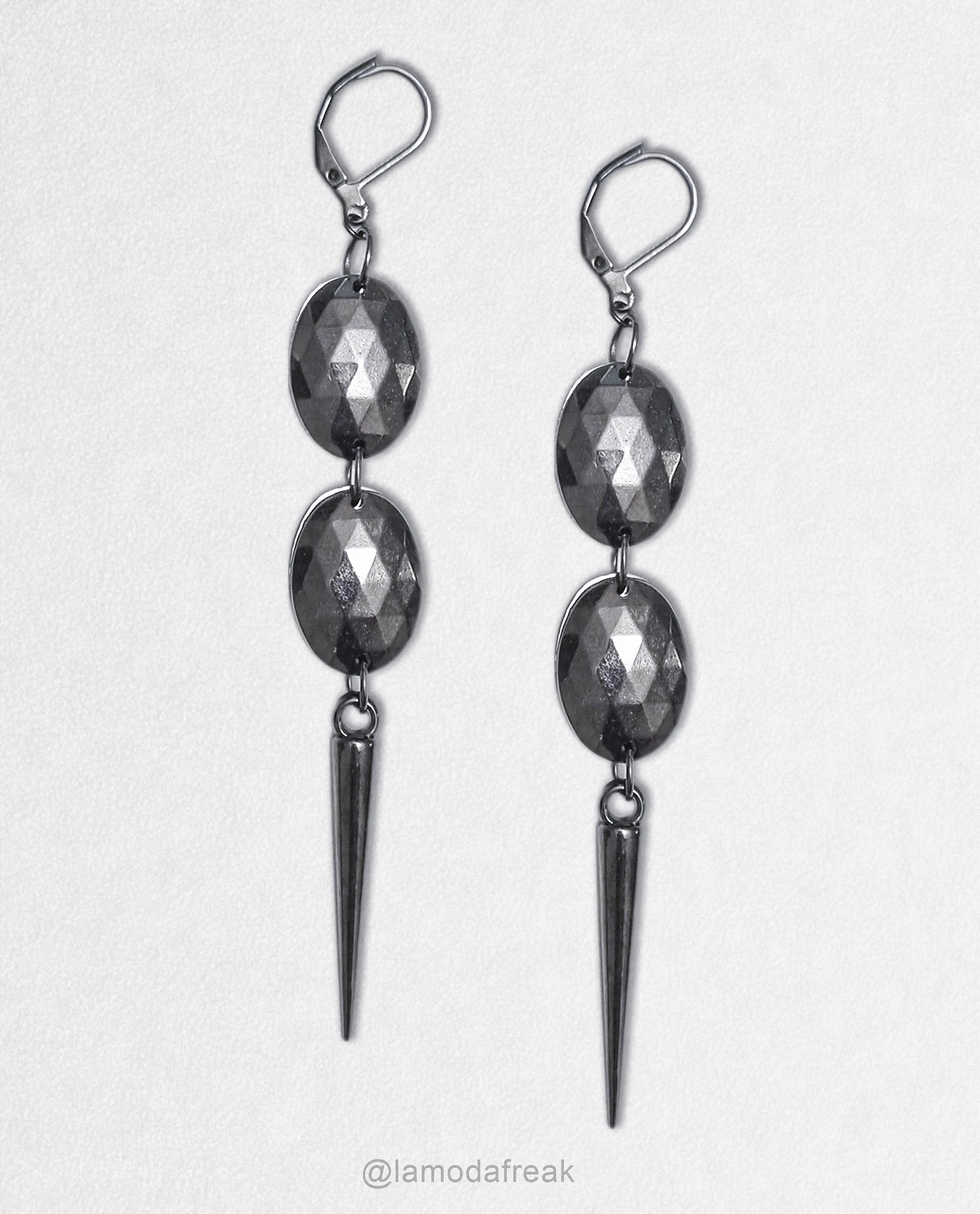 Descrição da peça: Brinco com dois chatons oxagonais duplos (são iguais na frente e atrás) na cor grafite, e spike de metal na cor grafite. O anzol é de metal grafite. Super leve.