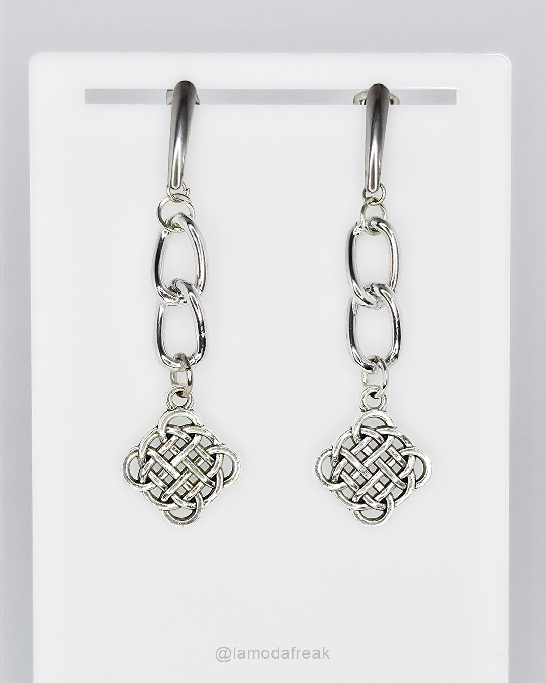 Descrição da peça: Brinco tipo pino com tarracha em metal prateados. Corrente de alumínio na cor prata claro, e pingente com símbolo de nó celta em metal prateado.