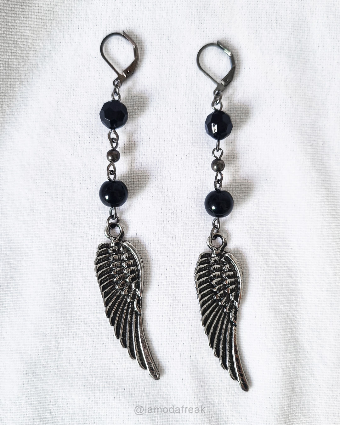 Descrição da peça: Brinco longo com gancho (fechado atrás) cor grafite, uma conta sextavada preta, uma conta menor na cor grafite, uma conta de pedra natural ônix, e pingente de asa também em grafite.