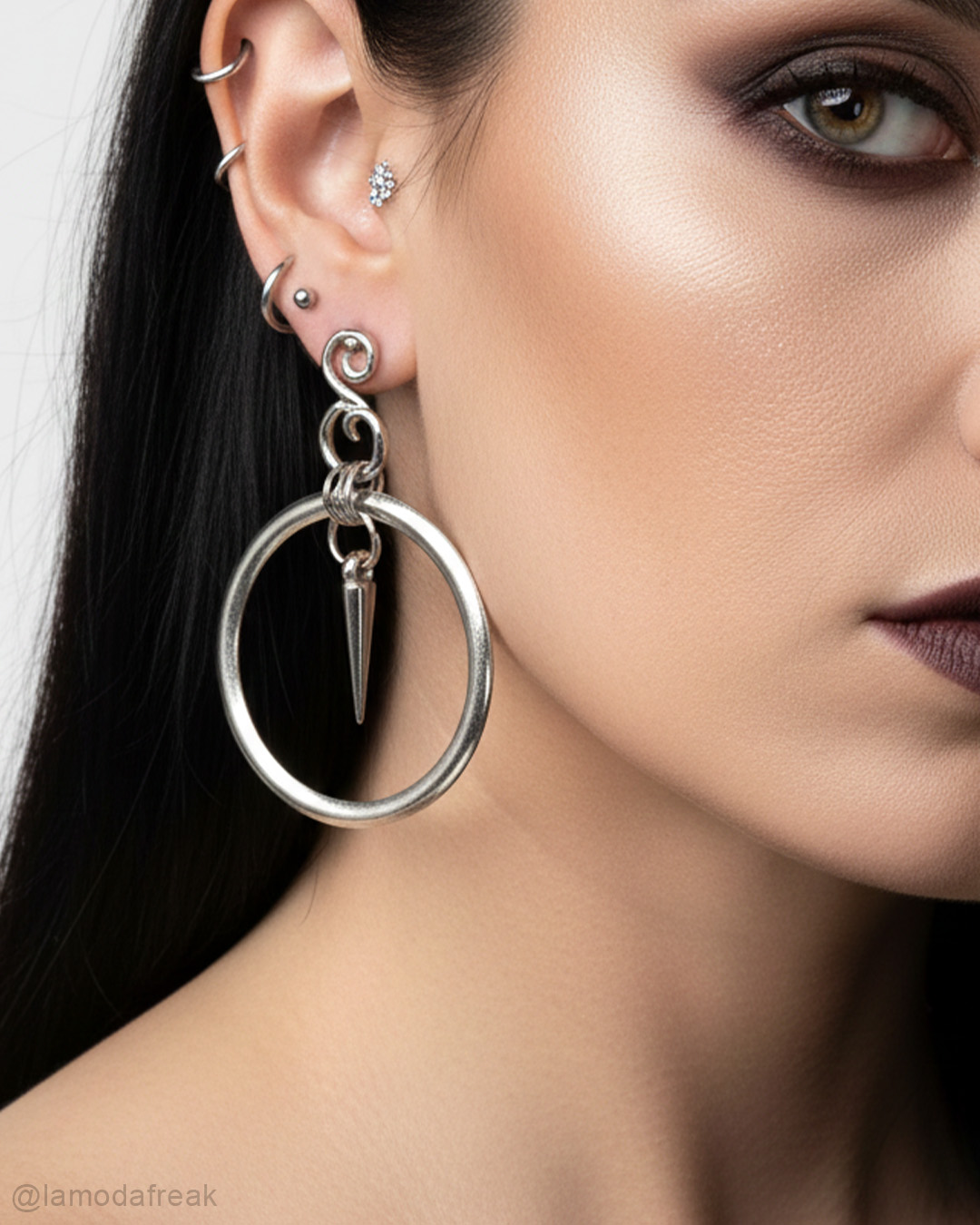 Descrição da peça: Brinco tipo anzol com argola e pingente de spike em metal prateado. A argola não é roliça, é "achatada".