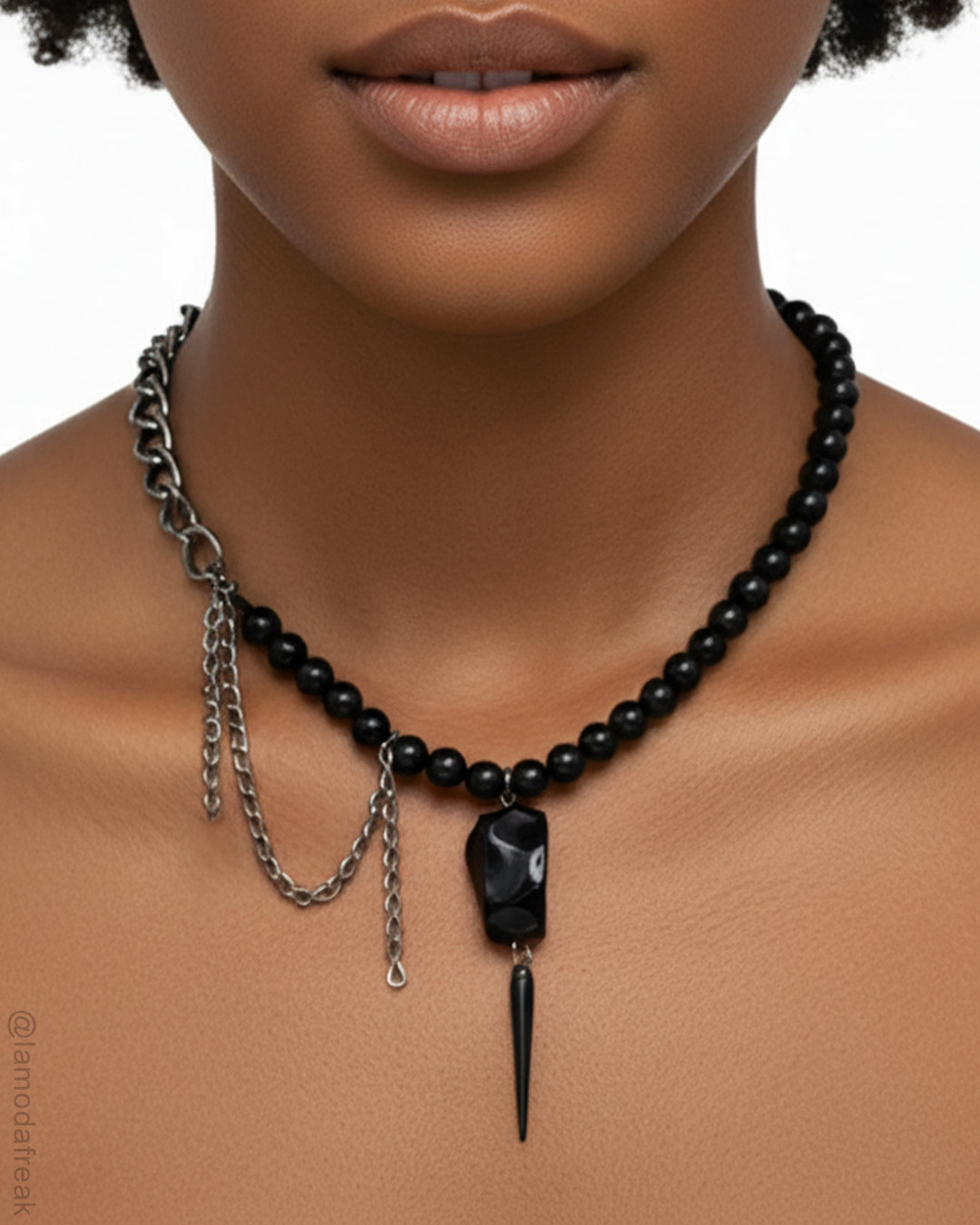 Descrição da peça: Colar com bolinhas pretas em ABS, correntes de alumínio na cor grafite, pedra natural Granada e spike preto. Fecho lagosta e comprimento regulável.