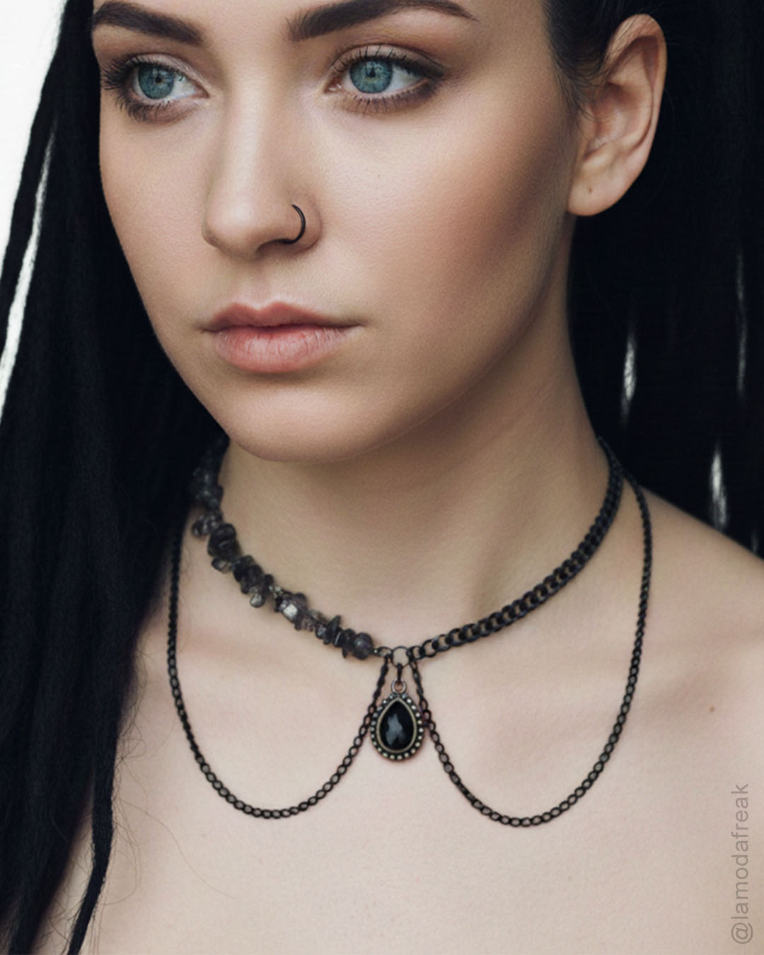 Descrição da peça: Colar com cascalhos de cristal cricket cinza, correntes de alumínio pretas, e pingente grafite com pedra preta em forma de gota.