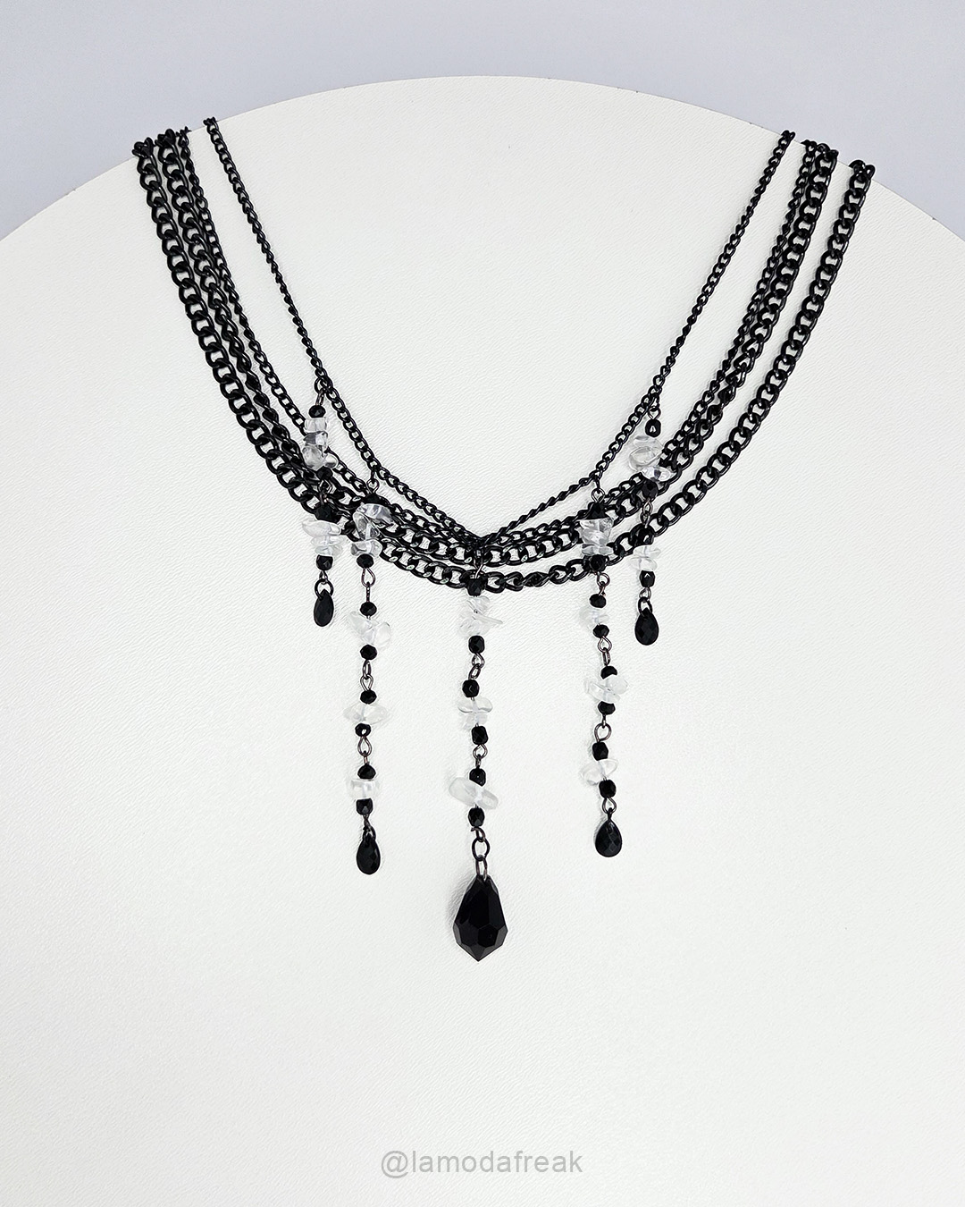 Descrição da peça: Colar feito com várias correntes de alumínio pretas com espessuras diferentes. Cascalhos de pedra natural quartzo branco. Contas pequenas, pingentes de gota pequenos e pingente de gota grande pretos em ABS. Fechamento em mosquetão. Corrente extensora.
