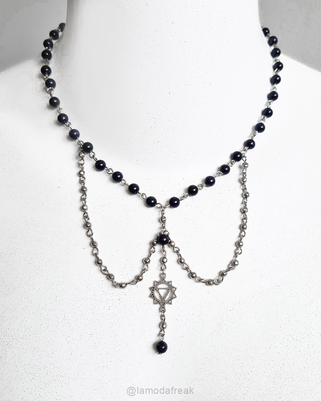 Descrição da peça: Colar com bolinhas de Pedra da Estrela, que tem uma cor azul escura com um brilho maravilhoso (veja a última foto). As bolinhas menores são prateadas. E o pingente prateado é símbolo do Chakra laríngeo.