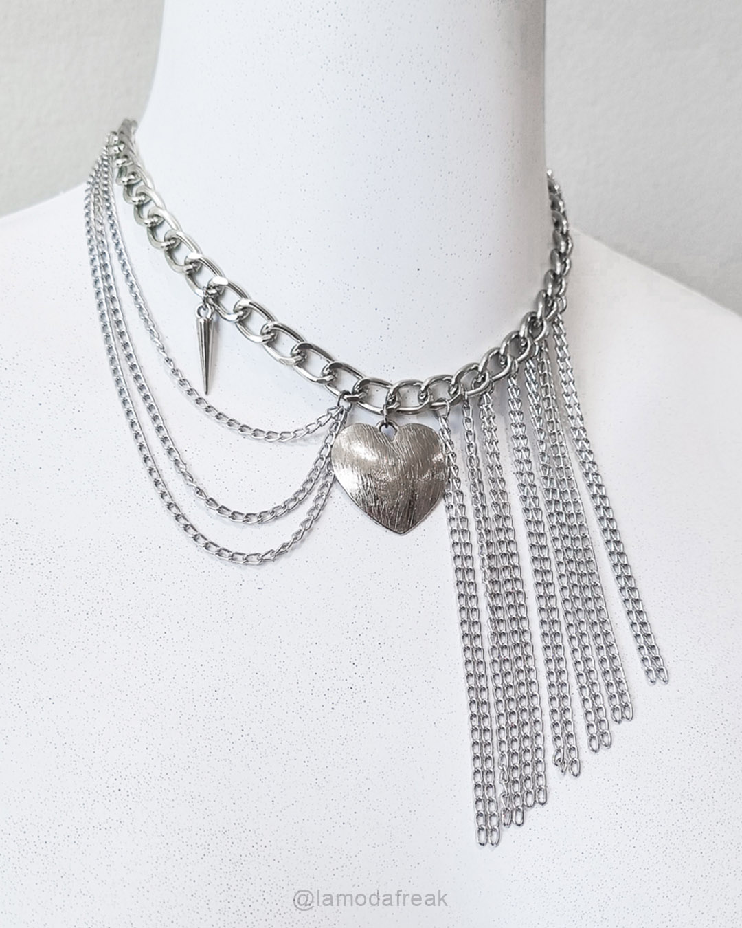 Descrição da peça: Colar com correntes de alumínio prateadas, pingente de coração em metal prateado e spike de metal prateado.