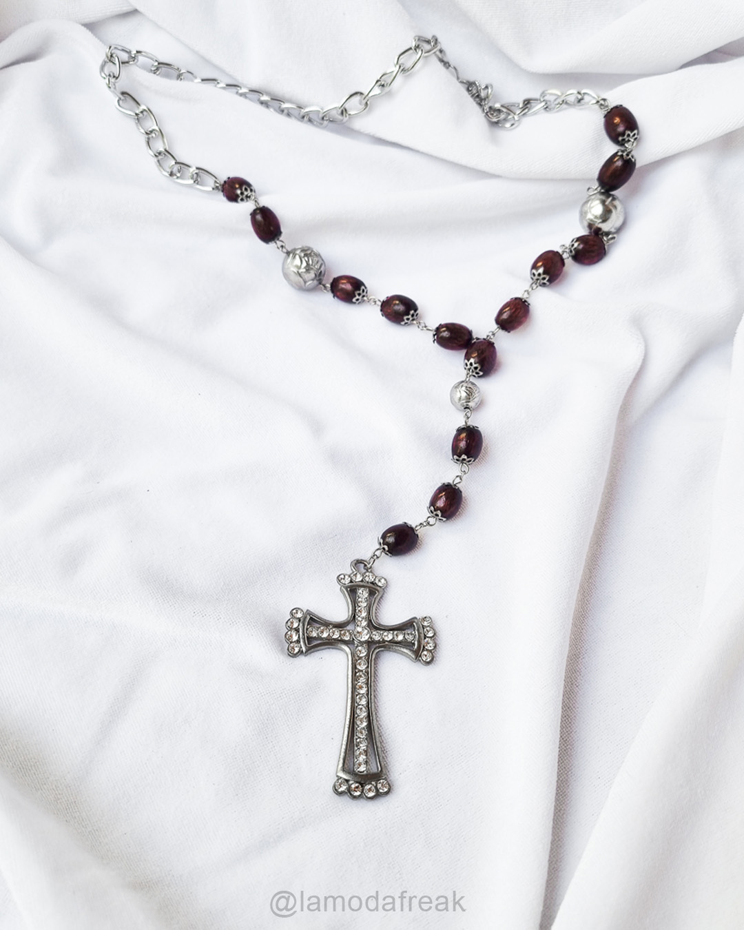 Descrição da peça: Colar em formato de terço feito com contas de madeira avermelhadas, bolas prateadas com detalhes que formam uma rosa, corrente prateada de alumínio e pingente de cruz de metal prateado com strass.