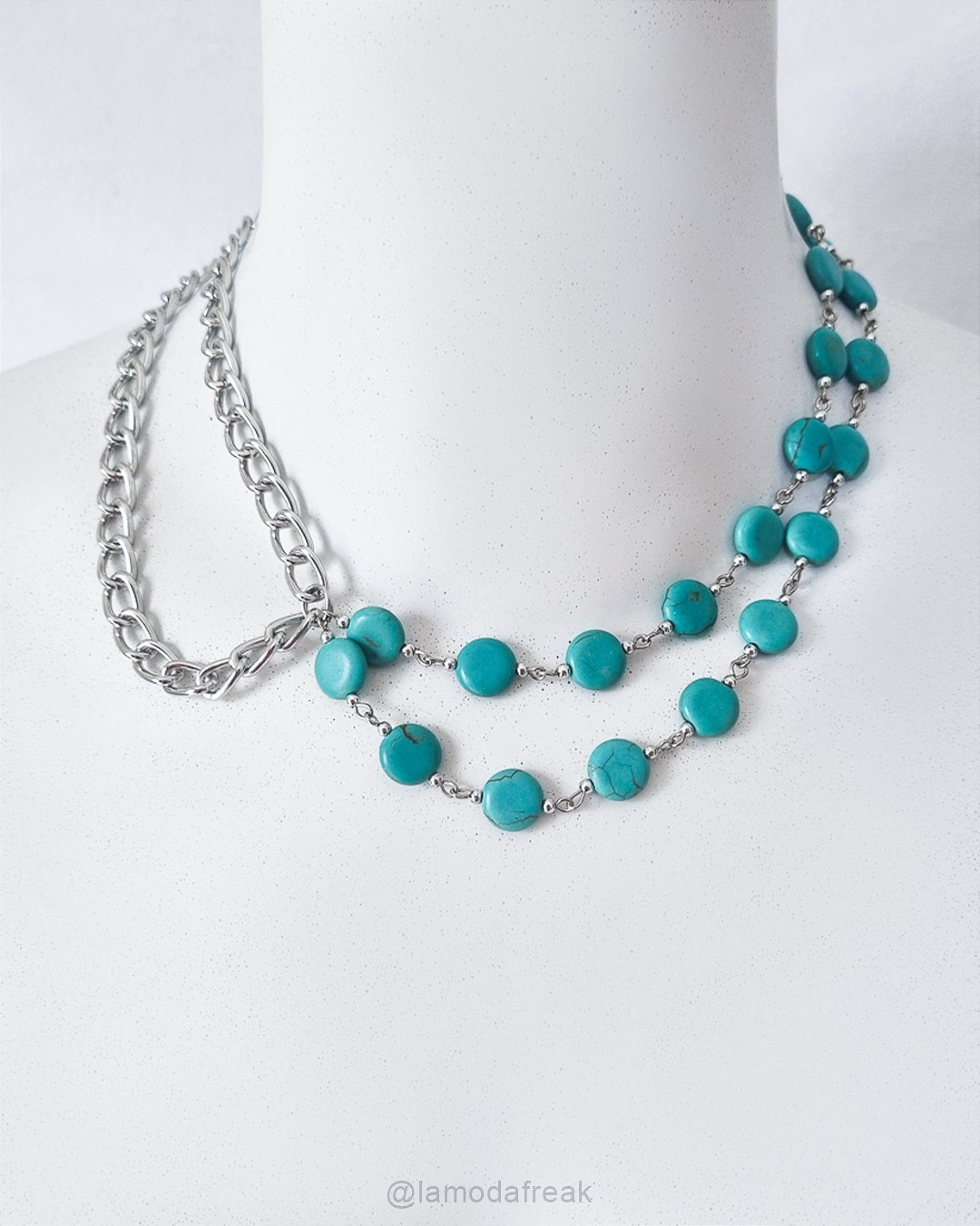 Descrição da peça: Colar com correntes de alumínio prateadas e discos de pedra natural Turquesa.