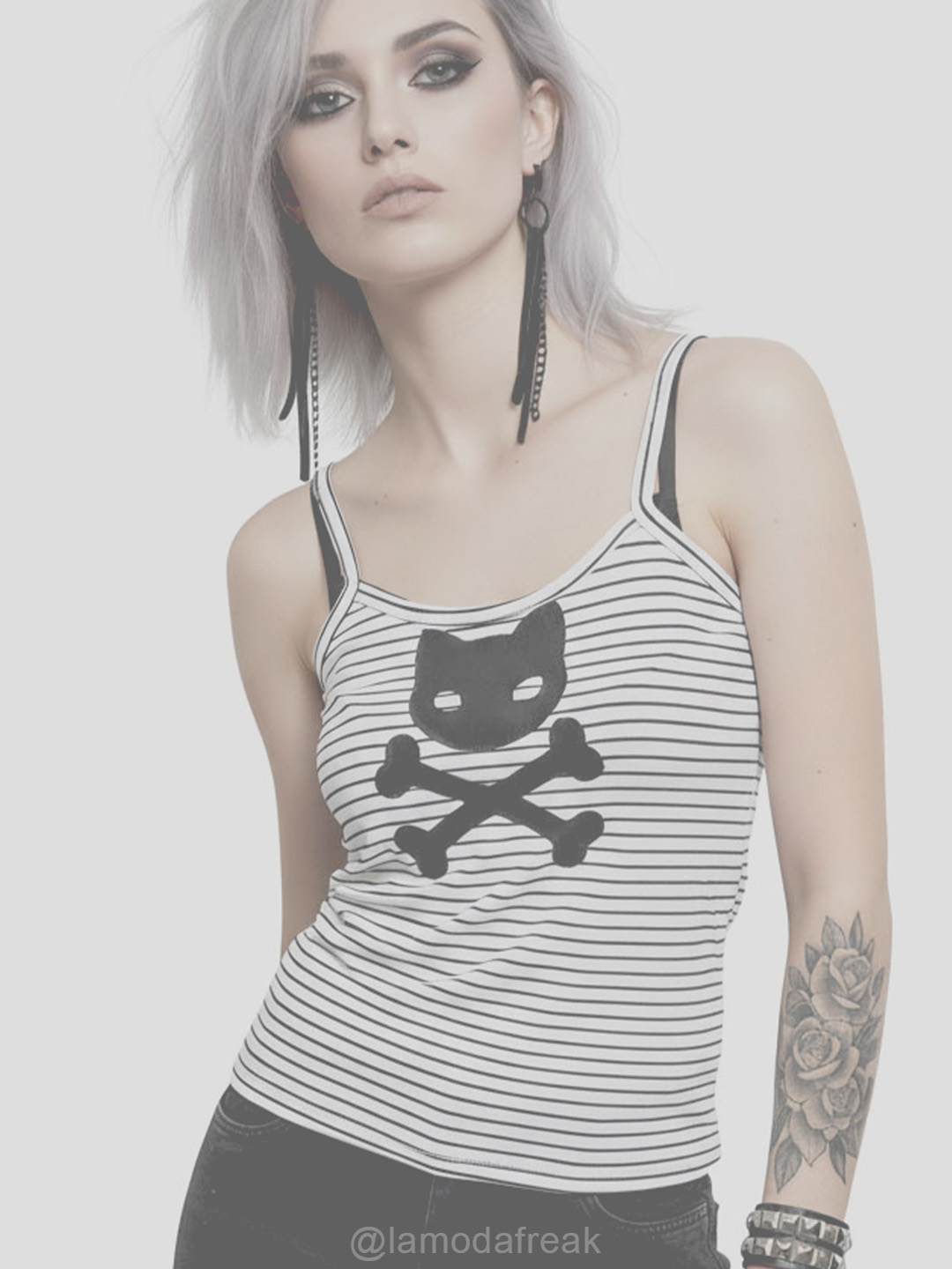 Descrição da peça: Regata de alcinha em viscolycra listrada branca e preta com aplicação de estampa de gato em malha cirrê preta.